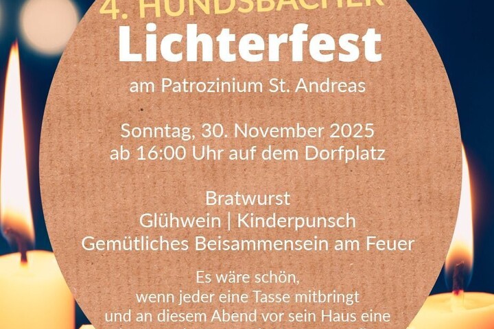 Am Sonntag, den 30. November 2025, dem Patrozinium St. Andreas, veranstaltet das Gemeindeteam wieder das Hundsbacher Lichterfest. Ab 16.00 Uhr gibt es auf dem Dorfplatz ein gemütliches Beisammensein am Feuer mit Glühwein, Kinderpunsch und Bratwurst. Es wäre schön, wenn jeder eine Tasse mitbringt und an diesem Abend vor sein Haus eine brennende Kerze oder Laterne stellt.